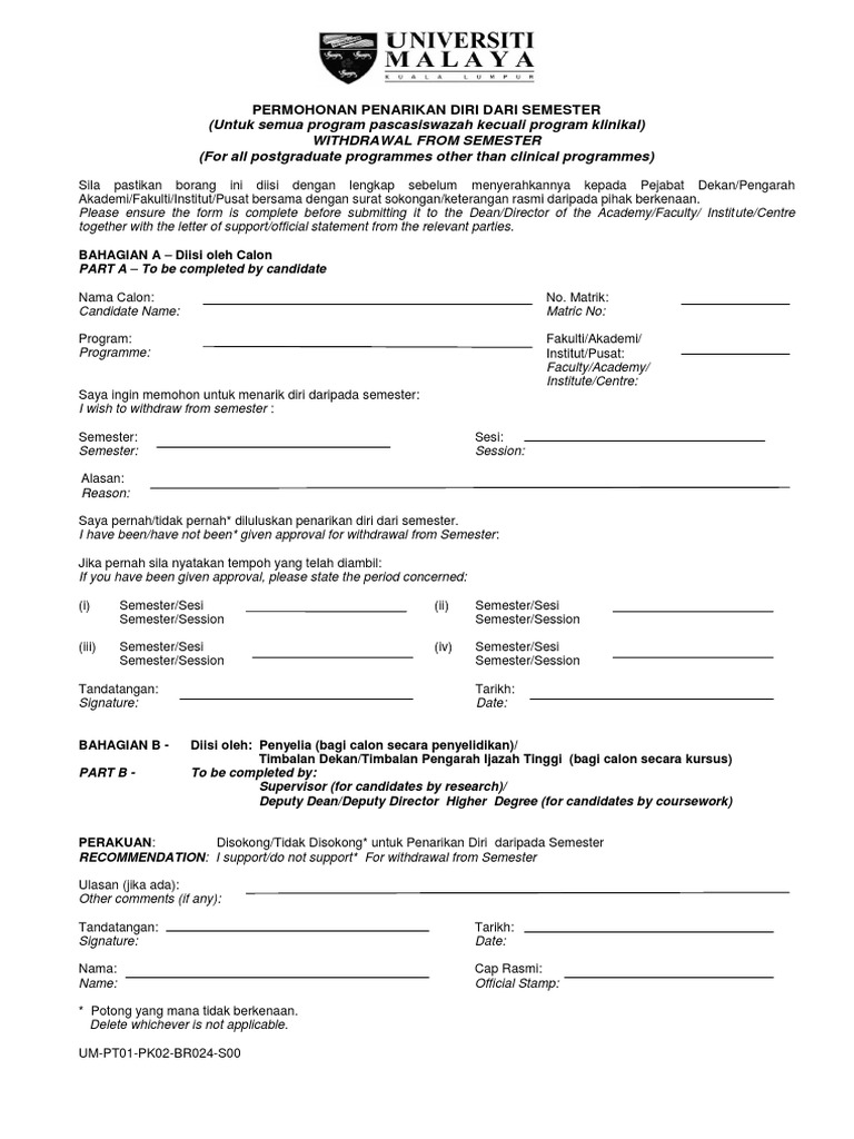 . Calon tidak dibenarkan menarik diri dari semester dalam keadaan berikut. GARIS PANDUAN UNTUK PENARIKAN DIRI DARI SEMESTER Guidelines For Withdrawal From Semester. Pekeliling borang permohonan elaun dan borang pengeluaran.